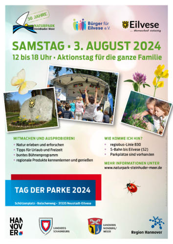 Am 3.8.24 findet der Tag der Parke statt. Eilvese ist, wie schon 2016, Ausrichter dieser Veranstaltung. In diesem Jahr feiern wir 50 Jahre Naturpark Steinhuder Meer. Mit einer Vielzahl von Ausstellern aus der gesamten Steinhuder Meer Region wird es ein buntes Programm aus Information und Unterhaltung geben. An dieser Stelle werden wir den aktuellen Stand der Planungen bekannt geben. Also….- öfter mal reinschauen. Programm „ Tag der Parke in Eilvese“ Kontakt